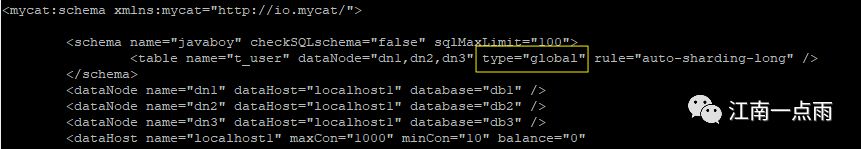 注意,在配置 sharding-by-intfile 规则时,一定要删除 type="global" ,否则配置不会生效。具体配置如下: