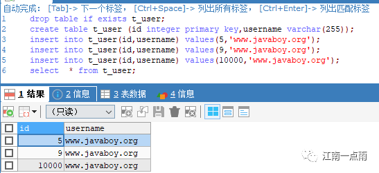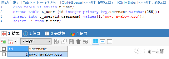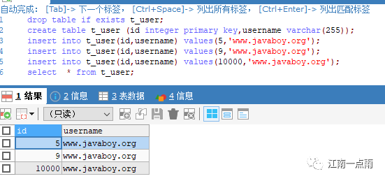insert into t_user(id,username,sharding_id) values(1,'www.javaboy.org',0);