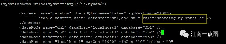 sharding-by-intfile 这个是枚举分片,就是在数据表中专门设计一个字段,以后根据这个字段的值来决定数据插入到哪个 dataNode 上。