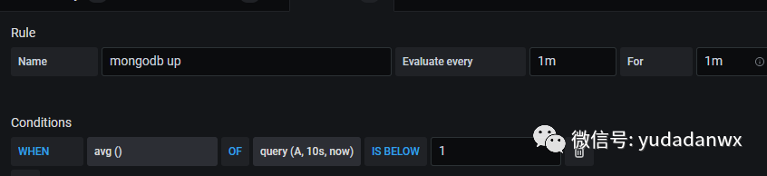 目前配置的报警比较简单,基于mongodb进程是否存在决定报警。使用的指标mongodb_up,如下图:
