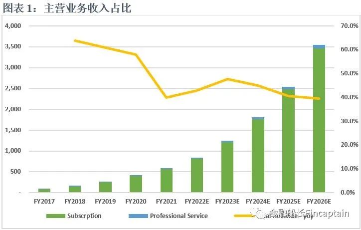 专业服务板块在公司总收入中占比较小,2021财年该板块占公司总收入的4.2%。我们预计该板块收入将随订阅板块客户基数提升而稳定增长,未来五年维持增长率25%至28%,在公司总收入中占比3%至4%。