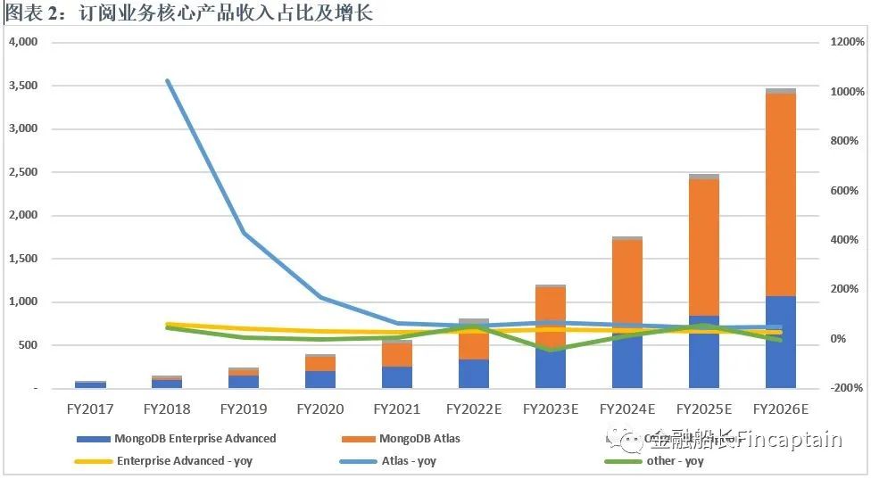 我们认为MDB产品订阅将为公司总收入带来持续的高增长,并且未来五年,该板块收入也将在公司总收入中占有稳定的份额(96%),在2026财年为公司带来35.5亿美元的收入。