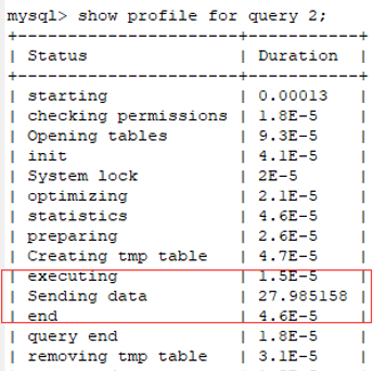 执行命令show profile for query query_id;即可查看业务sql的每个步骤以及花费的时间。输出结果默认按照执行顺序排序。写到这里,插一句,这两天遇到的业务上查询缓慢的原因,在进行上述分析后,结果如下:可以发现大量时间消耗在sending data。