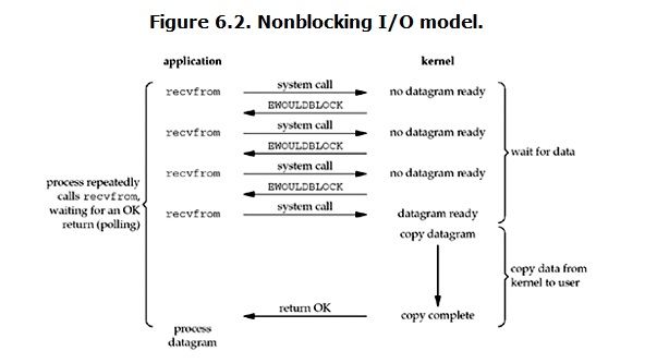 对比第一张同步阻塞IO的图就会发现,在同步非阻塞模型下第一个阶段是不等待的,无论有没有数据准备好,都是立即返回。第二个阶段仍然是需要等待的,用户态需要等待内核态把数据拷贝过来才能使用。对于同步非阻塞模式的处理,需要每隔一段时间就去询问一下内核数据是不是可以读了,如果内核说可以,那么就开始第二阶段等待。