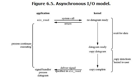 异步模式下,前面提到的两个阶段都不会等待。使用异步模式,用户态调用read方法的时候,相当于告诉内核数据发送给我之后告诉我一声我先去干别的事情了。在这两个阶段都不会等待,只需要在内核态通知数据准备好之后使用即可。通常情况下使用异步模式都会使用callback,当数据可用之后执行callback函数。