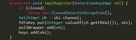 1、implRegister方法。在fdToKey的Map中插入channel对应的文件描述法和SelectionKey的映射,当做注册Channel、关闭Channel、取消注册等操作是都是操作此Map。