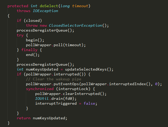 通过Java的Selector.select方法来获取准备好的键的时候实际执行的代码如下: