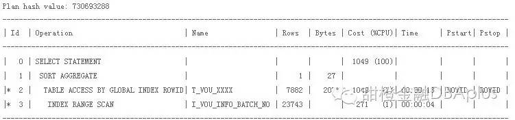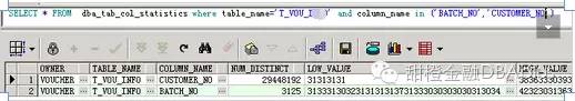 该表这2个列都有独自的索引。因此需要改造下。 列的统计信息如上, 通常我们建组合索引,选择性好的放在前面(可以避免index skip scan),因此按照常规的我们的索引列顺序为 ('CUSTOMER_NO','BATCH_NO'),但是如果这样建索引,对于我们的这个sql优化,没有用。从sql的where条件可以发现,若是走这个索引,则是(index full scan),因此这样是行不通的。故我们建索引的顺序为('BATCH_NO','CUSTOMER_NO'),并且删掉原来的batch_no上的冗余索引,因CUSTOMER_NO有单独的索引,因此index skip scan的情景就不必担心会发生。