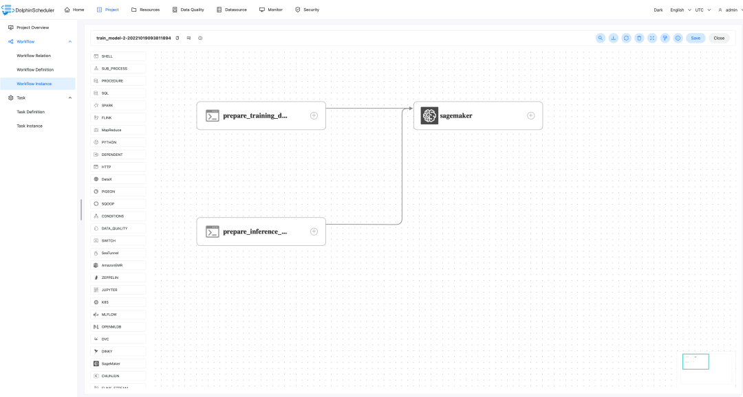 使用pydolphinscheduler来支持workflow as code的方式构建工作流,无需在页面点点点,运行一行命令即可快速创建工作流并运行 下载与处理完股票数据后,会将数据送到Amazon SageMaker中使用SageMaker Pipeline执行数据集处理,训练,评估以及批量推理