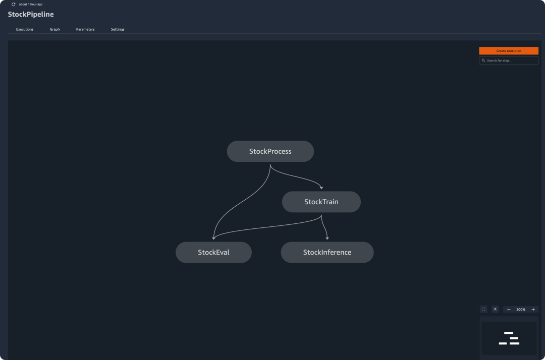 StrockProcess: 处理数据集成为SageMaker内置算法适配的格式,并切分为训练集,验证集和测试集 StockTrain: 训练模型 StockEval: 评估模型 StockInference: 使用模型进行批量股票预测