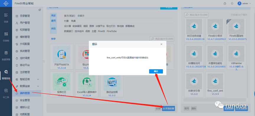 系统管理 > 插件管理 > 从本地安装,选择之前下载的本地文件“com.fr.plugin.decision.config.visual.v11-1.9.9.zip”,点击打开,提示上传成功,点击确定关闭窗口。