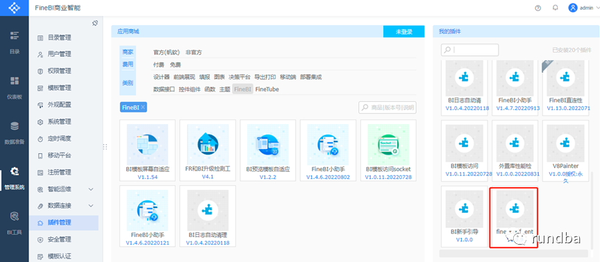 目前FineBI页面会跳转到FineReport插件页面,当前使用FineBI 5.1.26(当前最新版),下载适配版本FineReport 11.0的插件V1.9.9。