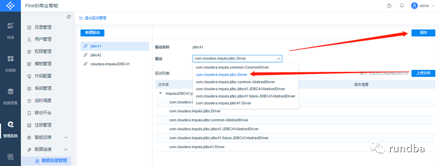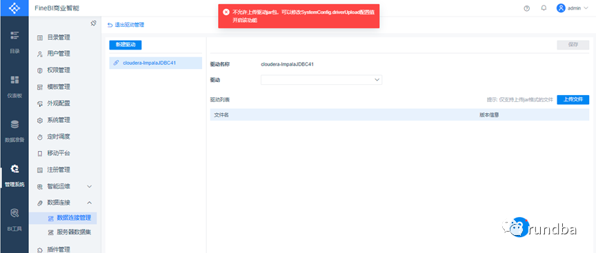 默认情况下,FineBI安装完成后,创建“数据连接”时,需要相应类型的驱动,如连接到cloudera imapala时,需要相应的JDBC驱动,默认情况下不允许通过驱动管理上传驱动,此时就需要安装“fine_conf_entity可视化配置插件”,通过插件修改数据库中SystemConfig.driverUpload参数,以允许上传驱动。
