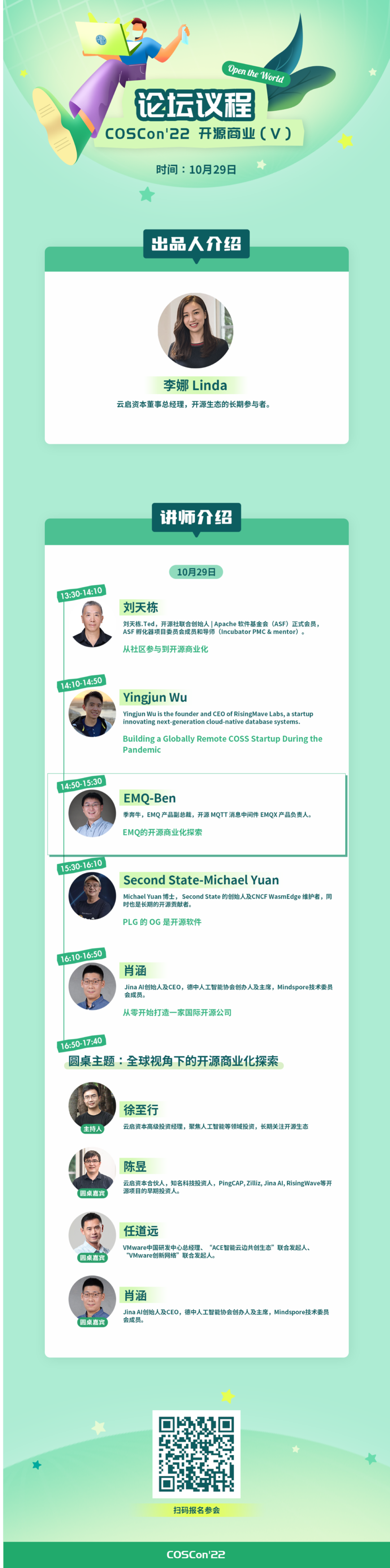 在圆桌对话环节,EMQ 联合创始人金发华还将与来自红帽、极狐、亚马逊云科技等公司的开源资深实践者共同分享为开源项目工作的心得体会,带领大家剖析开源内部世界的运作模式。