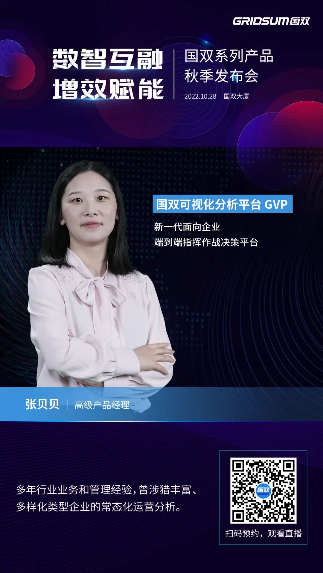 二十大报告指出要坚持把发展经济的着力点放在实体经济上,推进新型工业化,加快建设制造强国、质量强国、航天强国、交通强国、网络强国、数字中国。随着人工智能与实体经济的融合,实体经济的数字化转型正向纵深处发展,企业数字化转型将进入全面系统化、智慧生态化阶段。商业数据智能与企业数字化转型有着密不可分的关系,一方面表现为企业数字化转型工具离不开商业数据智能应用的支持,另一方面表现为二者应用价值的协同。伴随企业数字化转型的深入,商业智能行业应用也将往分析、智能、共享等方向发展。国双可视化分析系统(GVP)是新一代面向企业端到端指挥作战决策平台。它以“数据驱动”为核心,融合了数据接入与分析处理、2/3D可视化、AI预测、智能协同、移动应用等功能。”数据分析、可视化呈现、AI智能、协同协作“是商业智能助力企业激活数据潜能的四要素,GVP通过“BI+AI”驱动企业数字化转型。具体包括GVP可以帮助企业进行智能全局辅助决策,将“简单统计报告”演进为“深入洞察分析”,将“靠人经验决策”转变为“智能辅助决策”,将“线下的人为滞后汇报”升级为“线上实时透明管理”。GVP支持全面感知企业运营态势,方便标准化、智能化业务管理,具体通过集团统一经营指标可以让各级管理者实时感知业务发展,最终做到“问题找人”“事前洞察”与“定量管理”。GVP还可打造规范化、自动化的执行闭环,做到企业立体运营联动的高度协调。GVP在界面操作上支持拖拽式场景构建、多维数据探索与灵活交互体验,让研发、生产、运营、管理等不同岗位的用户能够快速上手,高效使用。在国产替代上,GVP可稳定运行在多款国产CPU硬件环境、操作系统中,并已完成国产数据库的对接。在即将举行的国双系列产品秋季发布会中,GVP将首次进行对外公开发布,届时国双高级产品经理张贝贝将向大家进行详细介绍。点击下方或扫描下方二维码预约直播,及时观看精彩内容!