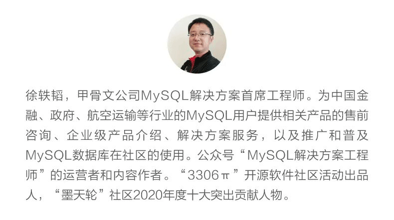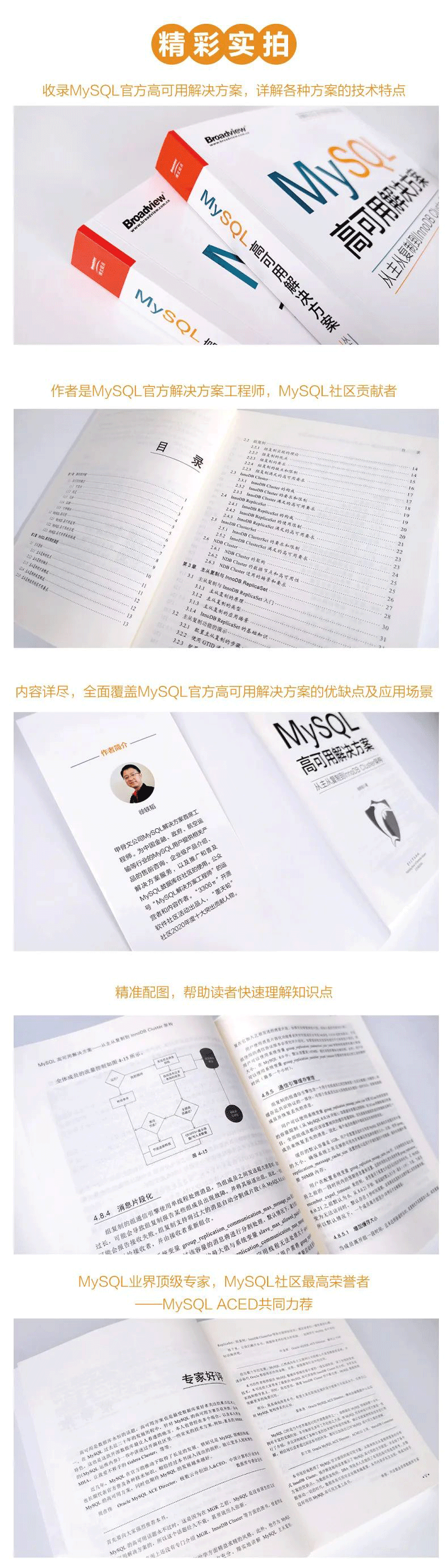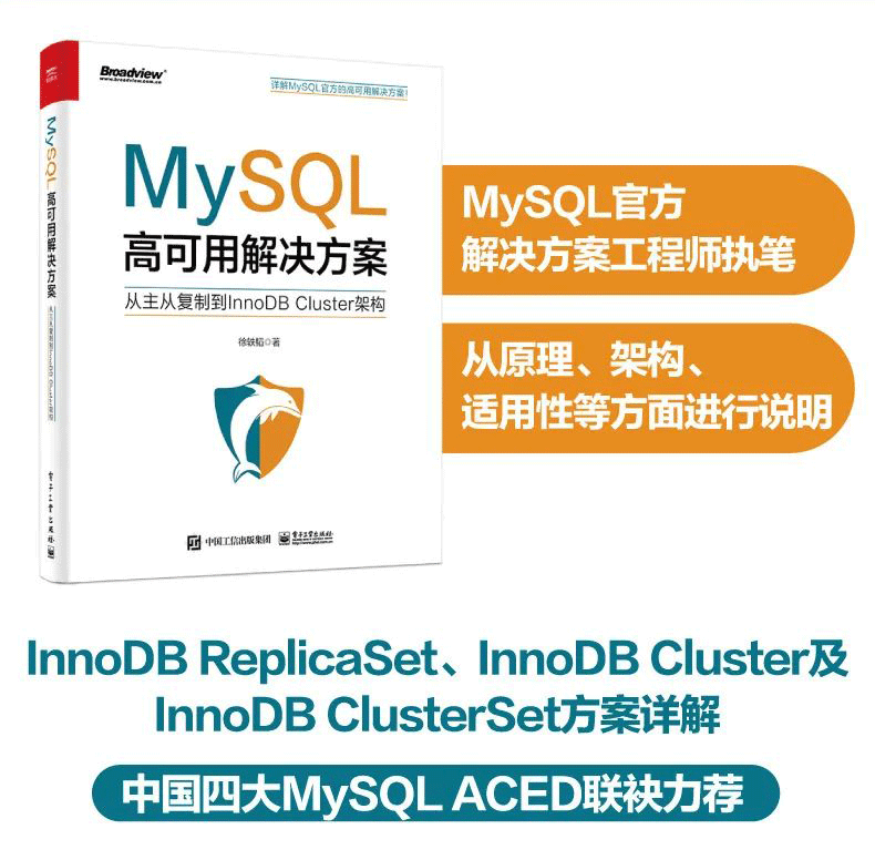 在MySQL二十多年的发展历程中,针对MySQL的高可用方案百花齐放,各具特色,这也是这款开源数据库最能让人着迷的地方。例如,早些年著名的MMM、MHA等等。随着MySQL官方的不断发力,在基于MySQL复制的基础上,推出了一系列的高可用方案,例如,主从半同步复制、InnoDB ReplicaSet、组复制(MGR)、InnoDB Cluster,及目前最新的InnoDB ClusterSet。如果您对此感兴趣,那可以种草本期小编推荐的好书,了解更多这些方案的详细内容!书中详细介绍了各种方案的优缺点,以及相关的技术细节,相信读者一定会从其中获得希望得到的内容。下面有请他出场~
