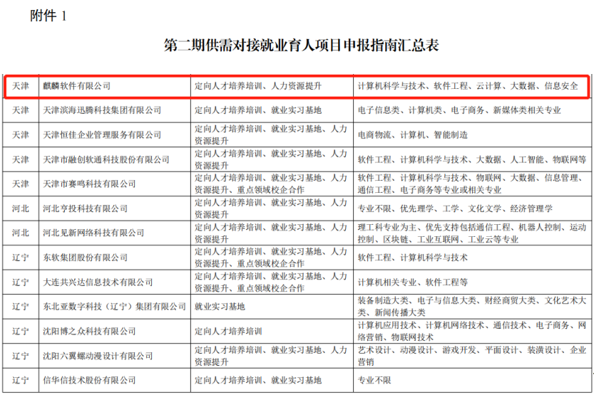 为深入贯彻落实党中央、国务院“稳就业”“保就业”决策部署,坚持就业优先战略,深化产教融合、校企合作,麒麟软件积极响应教育部高校学生司《关于征集第二期供需对接就业育人项目的函》的号召,积极申报并入选第二期教育部供需对接就业育人项目申报指南企业。