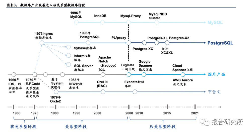 自 20 世纪 60 年代以来,数据库行业随信息技术发展而快速演变,主要经历了三大阶段:1)前关系型阶段(1964-1970):1964 年查尔斯·巴赫曼(Charles Bachman)开发出第一 个数据库管理系统,网状数据管理系统 IDS(Integrated Data Store)初步成型;随后为解 决阿波罗登月计划所需的大量数据,1968 年 IMS(Information Management System)系 统作为最早商业化的 DBMS 正式发布;此阶段数据库主要解决了数据独立存储、统一管理、 统一访问的问题,实现了数据与程序分离,但缺乏被广泛接受的理论基础;2)关系型阶段(1970-2008):1970 年,员埃德加·科德(Edgar F. Codd)发表《大型共 享数据库的数据关系模型》,关系型模型理论被初步提出;随后关系型数据库(Relational Database Management System,RDBMS)诞生,国际标准组织将 SQL 作为国际数据库 标准语言,并进行标准化,SQL 成为关系型数据库主流语言并引领变革,Access、MySQL、 PostgreSQL 等大批关系型数据库诞生,带动关系型数据库完成了从理论到实践的转换;3)后关系型阶段(2008-至今):随着 Web 2.0 的到来,数据量出现指数增长,传统关系型 数据库无法有效对应日新月异的数据类型及业务场景,为更有效地处理海量数据,应对多 样的数据结构,NoSQL、NewSQL 等非关系型数库脱颖而出,数据库迈入第三发展阶段。