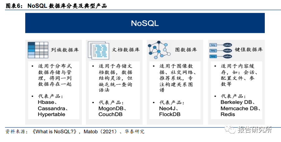 NoSQL 数据库尝试解决关系型数据库的扩展可用性缺陷。不同于关系型数据库,NoSQL 数据库只遵守 BASE 模型:基本可用 Basically Avaliable、软状态 Soft state、最终一致性 Eventual consistency:1)基本可用:当系统出现故障时,NoSQL 数据库不像关系型数据 库一样进行强制拒绝,而是允许损失部分可用功能或降低响应速度,以保证核心功能可用;2)软状态:在处理数据过程中,允许数据状态出现暂时不一致的情况;3)最终一致性:NoSQL 数据库只追求最终的结果一致,数据处理的过程中暂时不一致将被允许。NoSQL 数据库解决了关系型数据库刚性架构的拓展性缺陷,NoSQL 的动态架构可实现横向扩展。