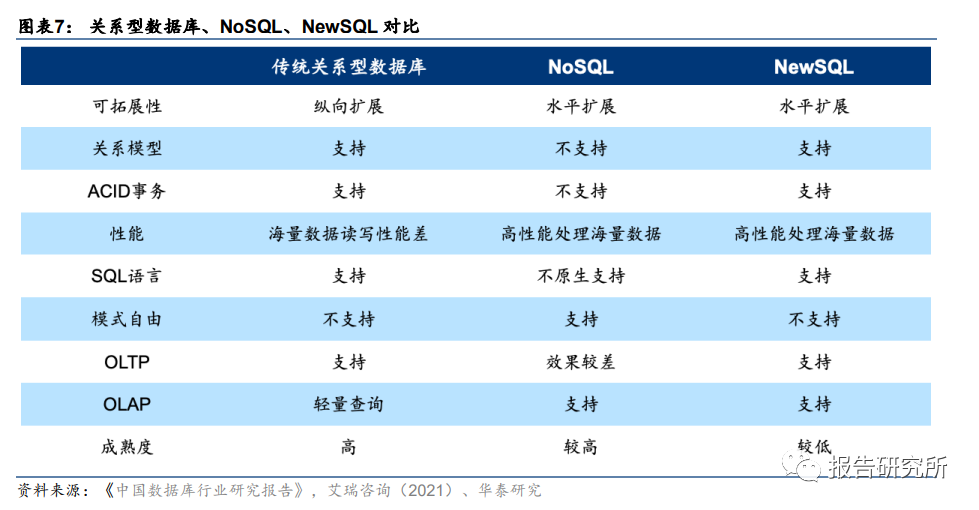关系型数据库与非关系型数据库各有千秋。对比来看,1)关系型数据库:严格遵守 ACID 原则,具备较强的约束性以及数据完整性,利于数据库的管理的同时也导致数据库难以扩 展,在业务快速发展的信息时代存在一定的成本劣势;其二维的数据结构减少了数据的冗 余,但读取海量数据效率不理想;作为传统数据库,关系型数据库发展时间长,技术成熟, 学习成本低;2)NoSQL 数据库:遵守 BASE 原则,相较于关系型数据库,更便于扩展, 储存模式简单,查询速度更快;但其极高的可用性在一致性上做出了妥协,使用成本较高 且不利于管理,相关技术具备较高的成熟度;3)NewSQL 数据库:在底层解决了事务一 致性问题,并整合了 NoSQL 在可扩展性、可用性上的优势,但 NewSQL 技术较新,学习 成本较高,且目前大多 NewSQL 只适用特定场景,距离普及还需要一定时间。