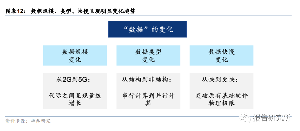在以上计算环境的变化下,我们看到,联网的数据也在发生深刻变化。数据的大小。目前联网数据量也在高速增长。通信技术的发展带动从 2G 到 3G、4G、5G 的演进,每代通信技术之间,联网的数据规模也呈现(几个)数量级的增加。对大容量、 高性能计算提出更高要求。数据的类型。计算场景的演变,我们对数据的定义也在发生变化。图片、语音、视频等非 结构化数据成为增量数据的主要类型。联网的数据类型也逐步从原来的结构化数据到非结 构化数据演变,这就对计算的并发性提出了更高的要求。数据的快慢。对数据的高速计算是计算机一直以来的追求。但原有的 IT 架构下,计算速度 的提升存在一定的物理条件限制。经典的 IT 架构已经存在了几十年的历史,当时的 IT 架构 并没有完全考虑到目前计算场景的变化。因此,新的计算场景下,对数据高速计算的追求, 需要我们从底层基础软件的变革开始。我们看到无论芯片、操作系统还是数据库,都在经 历深刻变革。