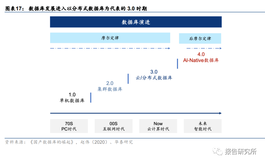 在非结构化数据与高并发计算需求的推动下,分布式数据时代加速到来。在计算、数据的 双重变革下,我们认为,数据库行业的发展演进也将经历重要的技术变革。在传统计算环 境和数据类型方面,传统的关系型数据库依然发挥着重要的作用;但面向未来新的计算场 景与数据需求,数据库产品亟需进行技术升级以适应下游需求的变化,通过统计国内外典 型数据库厂商的技术路线及产品体系变化,我们判断,数据库行业已进入以云数据库、分 布式数据库为代表的 3.0 阶段。