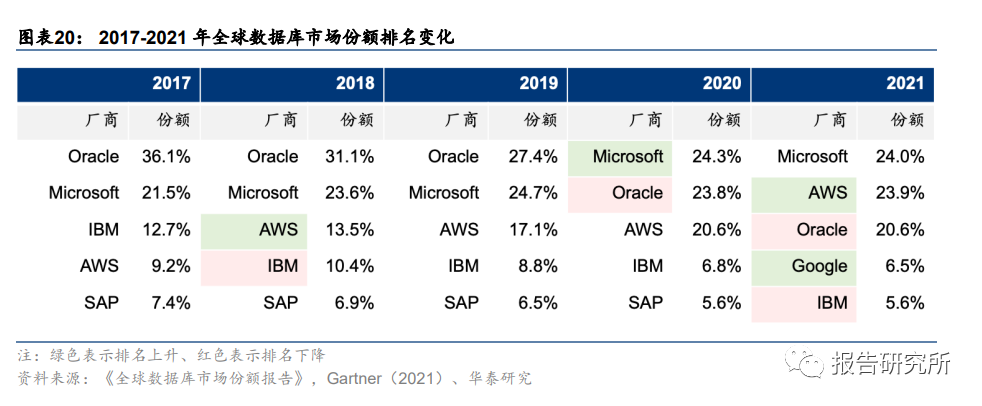 根据 Gartner 发布的《全球数据库市场份额报告 2021》,微软连续两年市场占有率排名第一, 2021 年占全球市场份额 24.0%,与 2020 年相比略有下降;亚马逊云科技 AWS 市场占有 率排名上升,主要受其云数据库产品快速增长带动,2021 年 AWS 云数据库产品同比增长 42.3%,约为全球云数据库市场增长率 22.3%的两倍;Oracle 数据库市场占有率排名略有 下降,2021 年占全球市场份额 20.6%,主要由于 Oracle 云数据库增速远低于市场增速。
