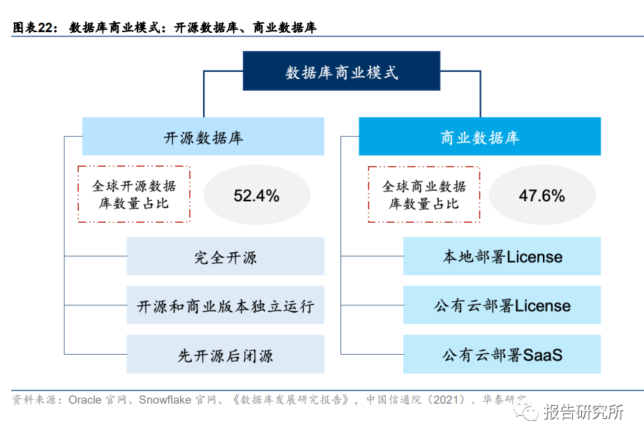 数据库产品包含开源数据库、商业数据库两种商业模式。其中,商业数据库收费方式主要 有两种:1)本地部署:本地部署的商业数据库,一般采用 License 订阅方式收费,一般按 用户数或者按 CPU 数定价,按年订阅,以 Oracle 为典型代表;2)公有云部署:公有云部 署的商业数据库,除了 License 收费还可采用 SaaS 收费方式,用户可按用量付费,按年/ 季度/月收费,以 Snowflake 为典型代表;开源数据库供用户免费使用,主要商业模式包括 三种:1)完全开源式:借助基金会完全托管,以 HBase 为典型代表;2)开源版本和商业 版本分别运营:通过运营开源版本社区积累人才、应用场景、市场品牌等,再通过售卖商 业版本获取利润,以 TiDB 为典型代表;3)先开源后闭源:运作前期通过开源社区优化产 品与品牌,之后停止社区的维护将产品闭源商业化,以 Neo4j 为典型代表。