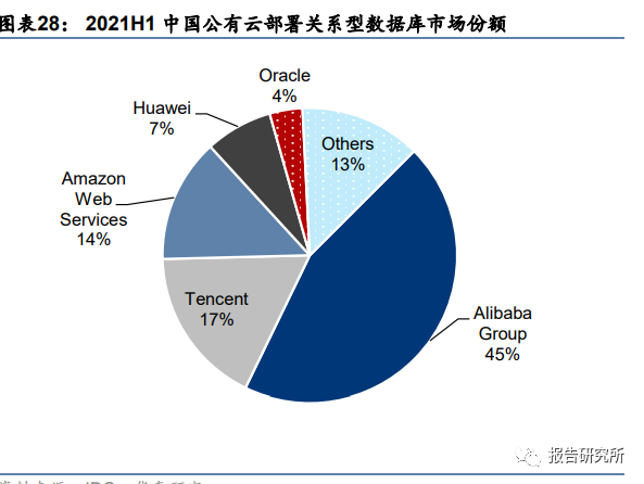 经过多年技术研发和经验积累,国产数据库市场份额逐年提升。以人大金仓、南大通用、 神舟通用为代表的国产数据库厂商自 1999 创建以来不断发力,逐步打破了海外厂商的垄断 局面,同时数据库初创厂商、云厂商等也加速发力,快速替换海外数据库厂商的市场份额。根据智研咨询数据显示,国产数据库企业的市场占比已从 2009 年的 4.19%提升至 2017 年 的 16.64%;根据艾瑞咨询发布的《中国数据库行业研究报告》,2020 年国产数据库市场占 比已提升至 47.4%,其中传统数据库厂商占比 7.1%,国产云数据库等新兴厂商占比40.3%。根据 IDC 发布的《2021 年上半年中国关系型数据库软件市场跟踪报告》,在传统部署模式 市场中,华为、阿里、达梦数据、人大金仓的市占率分别为 14.7%、5.7%、5.7%、5.0%, 在公有云部署模式市场中,阿里、腾讯、华为的市占率分别为 44.7%、17.4%、7.4%。