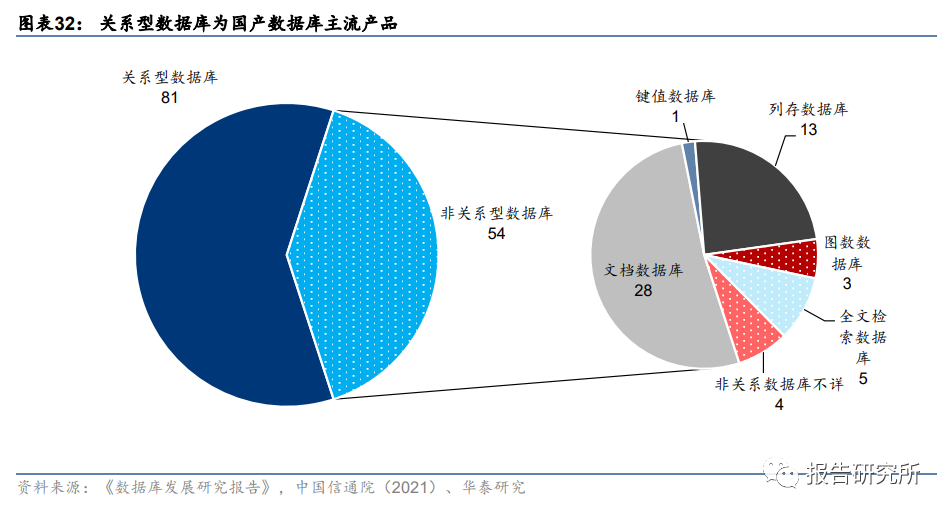 关系型数据库占主流,多基于 MySQL 和 PostgreSQL 二次开发而来。关系数据库作为 传统数据库产品,诞生时间早于非关系型数据库,产品体系更加成熟,在我国数据库市场 中占据主流地位。1)从数据库数量来看:根据中国信通院发布的《数据库发展研究报告》, 截至 2021 年 6 月,我国数据库产品共有 135 款,其中关系型数据库 81 个,占比 60%, 非关系型数据库 54 个,占比 40%;关系型数据库中基于开源数据库 MySQL 和 PostgreSQL 进行二次开发的个数分别为 23 和 24 个,分别占关系型数据库比例为 28.40% 和 29.63%,合计占比为 58.03%。2)从市场份额来看:根据艾瑞咨询发布的《中国数据库 行业研究报告》,关系型数据库市场份额占比约为 90%,非关系数据库市场份额仅约为 10%。