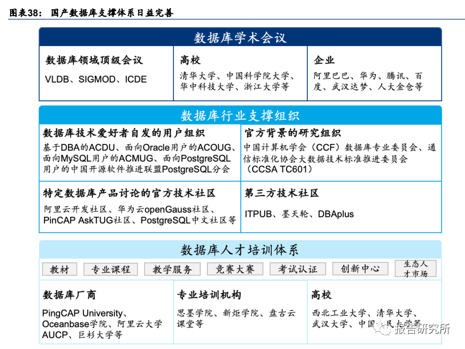 初创厂商多基于新兴数据库技术,关注非关系型数据库细分赛道。2015-2018 年大批初创 数据库厂商成立,包括费马科技、创邻科技、欧若数网、蜀天梦图等图数据库厂商以及浙 江智臾、涛思数据等时序数据库厂商。据艾瑞咨询统计,2015 年前后成立大部分初创厂商 均采用 NewSQL、SQL on Hadoop、NoSQL 等新技术架构,主要原因在于新技术架构尚处 于发展阶段,同时更符合互联网、金融、物联网等应用场景的业务需求,为初创厂商实现 新场景下的“弯道超车”提供了更大的可能。初创厂商纷纷涌入非关系型数据库细分赛道, 有望带动基于新技术架构的非关系数据库快速发展,据艾瑞咨询预测,2020-2025 年以初 创厂商为代表的新兴数据库市场规模有望实现高于 10 倍的增长。国产数据库的支撑体系不断完善。数据库支撑体系包括学术组织、行业支撑组织、人才培 训体系三大类:1)学术组织支撑:主要包括高校、企业的学术理论研究,以及相关论文在 学术领域的学术影响;2)行业支撑组织:主要包括具备官方背景的研究组织、数据库从业 人员牵头发起的用户组织、由数据库企业组建的官方技术社区、汇聚数据库整体行业信息 的第三方技术社区等;3)人才培训体系:主要包括高校教育培训、专业机构培训以及企业 培训。