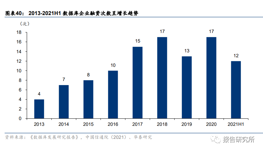 各路资本纷纷注入数据库产业,产业态势明朗。根据中国信通院统计,自 2013 年至 2021 上半年,数据库企业累计完成融资约 42 次,单年融资企业次数呈现明显的上涨趋势。根据 沙利文发布的《2021 年中国分布式数据库》报告,2021 年是国产数据库投融资最活跃的 一年,2021 年获得新一轮融资的企业就多达 20 家,千万级甚至上亿级融资数量在 14 轮 以上,其中偶数科技完成 B+轮融资 2 亿元,四维纵横完成 A 轮融资 1 亿元,智臾科技完成 B 轮融资 1 亿元。国产数据库的投资方包括红杉、高瓴、经纬、云启、明势等众多知名投 资机构,国产自研数据库产业趋势明朗,有望在资本注入下实现强劲增长。