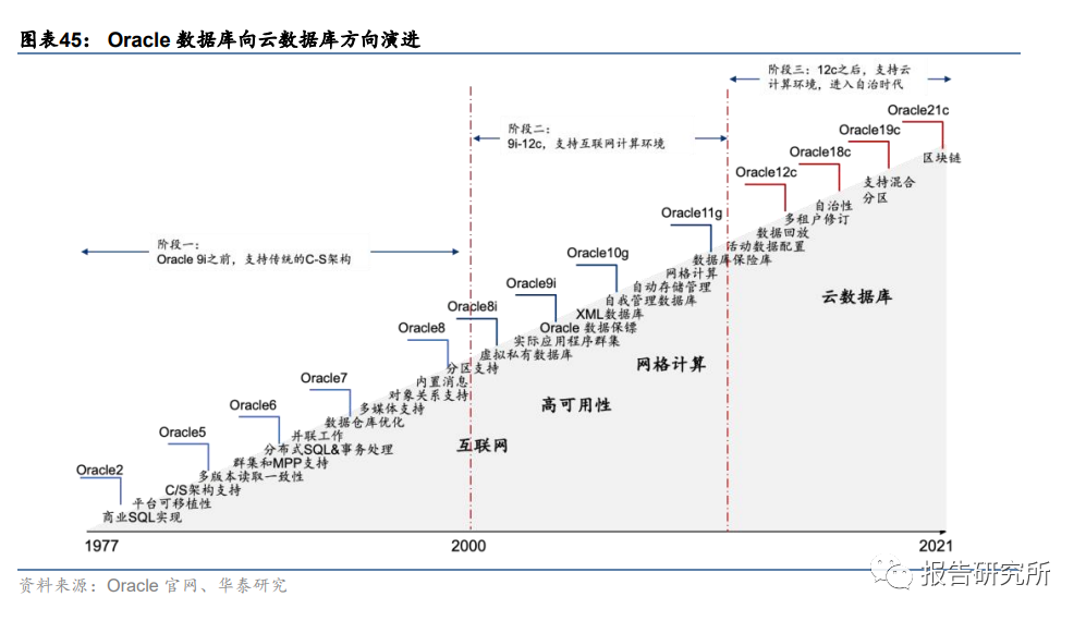 随着 IT 架构、终端设备形态的不断变化和迁移,Oracle 的数据库产品也在不断更新迭代。从 Oracle 数据库产品服务的计算载体的形态来看,经历了小型机与大型机、客户机/服务器 (PC 与服务器)、互联网架构/瘦客户端、数据库云/大数据四个阶段。目前 Oracle 的数据 产品已经更新到 21c。从以往 Oracle 更新的版本来看,我们可以将其划分为几个不同时代: