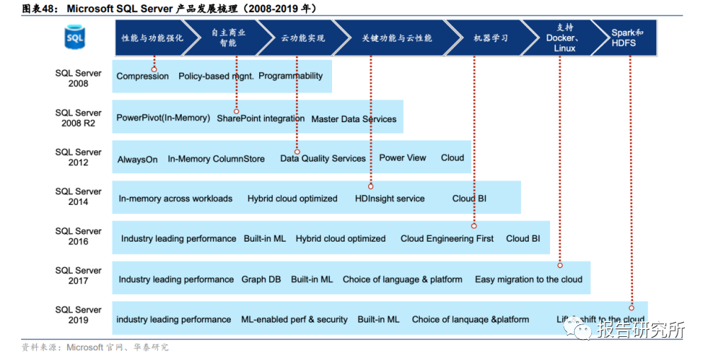 Microsoft数据库产品多为关系型数据库。Microsoft于1988年推出Microsoft SQL Server, 为企业提供商业数据管理;1992 年推出 Microsoft Access,为软件设计师与分析师提供便 捷的应用开发软件;2010 年推出 Microsoft Azure,为用户提供云端数据库服务,以上三款 产品皆使用关系型数据库模型。Microsoft SQL Server 历经多年迭代,目前包括本地、云端两大产品类别。Microsoft SQL Server 的发展大致可分为三个阶段:1)合作创始初期(1988-1995 年):SQL Server 最早由 Microsoft、Sybase、Ashton-Tate 三家公司共同开发,最早于 1988 年推出了 OS/2 版本;随后 Aston-Tate 退出,1992 年 Microsoft 与 Sybase 共同开发了基于 Windows 系统的 SQL Server,但在 SQL Server 4 后 Microsoft 与 Sybase 分道扬镳,于 1995 年独立完成 SQL Server 6.0 版本的开发;