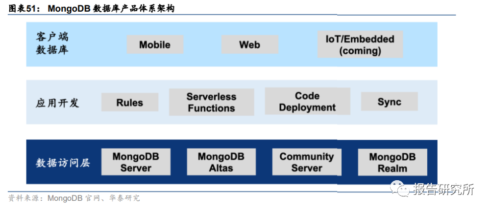 MongoDB 遵从开源协议提供商业数据库产品。MongoDB 产品体系主要由企业级数据库产 品 MongoDB Enterprise Advanced、云数据库 MongoDB Altas、开源数据库 Community Server、移动数据库 MongoDB Realm。1)MongoDB Enterprise Advanced:为企业级数 据库平台,包括商业数据库服务器、企业级管理工具、图形用户界面、分析工具集成等功 能;2)MongoDB Altas:为完全托管的云数据库产品,包括全面系统监控、托管备份、恢 复等功能;3)Community Server:为免费下载的开源版本;4)MongoDB Realm:为用 于数据密集型网页的移动数据库,可借助 Realm Sync 实现边缘设备数据到后端云数据库的 无缝同步。