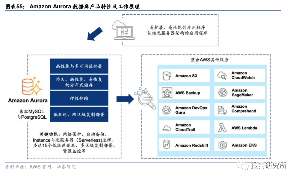 Amazon Aurora 是 AWS 关系型云数据库的典型代表,兼容 MySQL 与 PostgreSQL。Amazon Aurora 是 AWS 从 2014 年开始开发并提供的云原生关系型数据库,专门面向云计 算场景,实现了传统企业数据库的性能、可用性与开源数据库的简单性、成本效益的有机 融合,可与 MySQL 和 PostgreSQL 完全兼容。Amazon Aurora 作为高性能数据库,兼具高 性能和高可扩展性、高可用性和持久性、高度安全、完全托管等重要特性,服务三星 Samsung、 Halliburton、任天堂 Nintendo、A+E Networks 等多类型客户。