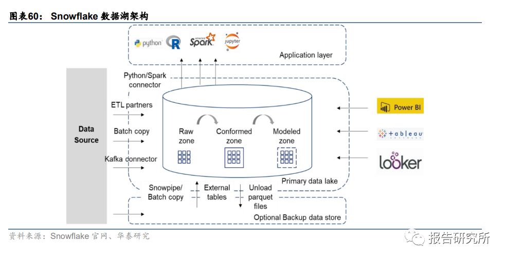 数据仓库满足多种使用场景需求。数据仓库采取 Shared-nothing 架构,在节点之间不共享 任何数据,此外 Snowflake 基于 Multi-cluster, shared data 的概念,将存储和计算分离,解 决了升级扩容时需要重新分配节点资源等痛点。在数据支持方面,Snowfalke 支持结构化和 半结构化数据的组合使用,可以接收 JSON、XML 或 Avro 格式的数据,并且支持嵌套和重 复数据类型,从而满足传统数据库、Hadoop 等半结构化使用场景的使用需求。
