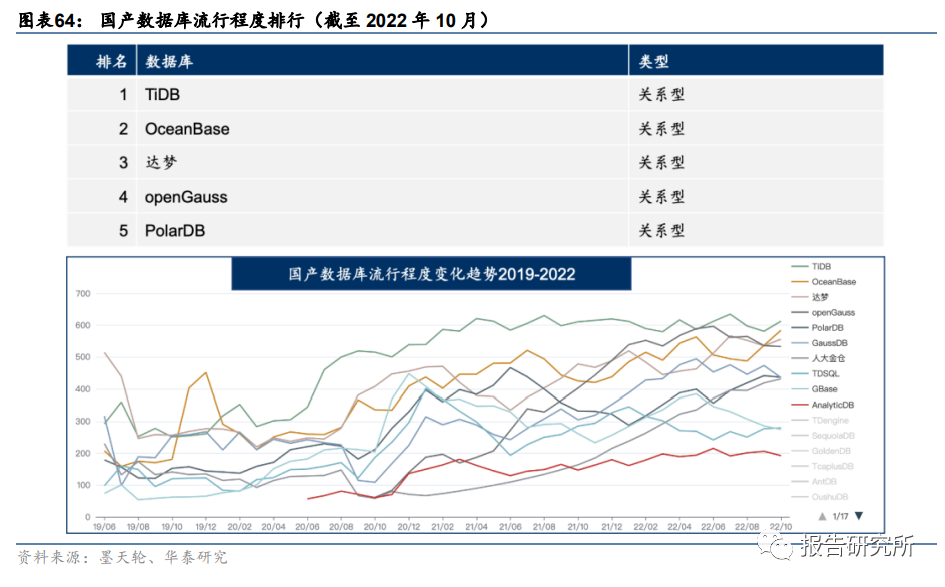 根据墨天轮发布的国产数据库流行度最新排行(2022 年 10 月),国产数据库排名前五名依 次为:TiDB、OceanBase、达梦、openGauss、PolarDB。我们选取传统数据库代表武汉 达梦、人大金仓,云数据库代表 OceanBase,GaussDB,新兴数据库代表巨杉数据库、TiDB、 星环科技KunDB作为范例,对国产数据库厂商的发展历程及现有产品体系进行了详细梳理。