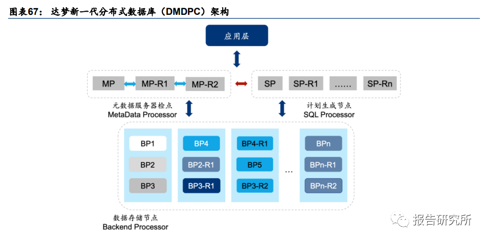新一代分布式数据库 DMDPC 具备极致的横向扩展能力。2022 年,达梦数据发布新一代分 布式数据库产品 DMDPC,DMDPC 数据库无状态计算节点,可随数据库并发压力负载按需 增加或减少节点,具备极致的横向扩展能力。同时 DMDPC 支持分布式事务(满足 ACID 规范)、数据分片的多副本容灾、多机并行协同计算,适用于 HTAP 场景。DMDPC 架构包 括三类节点:1)计划生成节点 SP:对外提供分布式数据库服务,也会分配执行带有汇总 性质以及不包含数据扫描操作的子任务;2)数据存储节点 BP:访问数据并进行简单的过 滤、投影以及分组操作;3)元数据服务器节点 MP:获取 SP、BP 节点的数据字典信息。