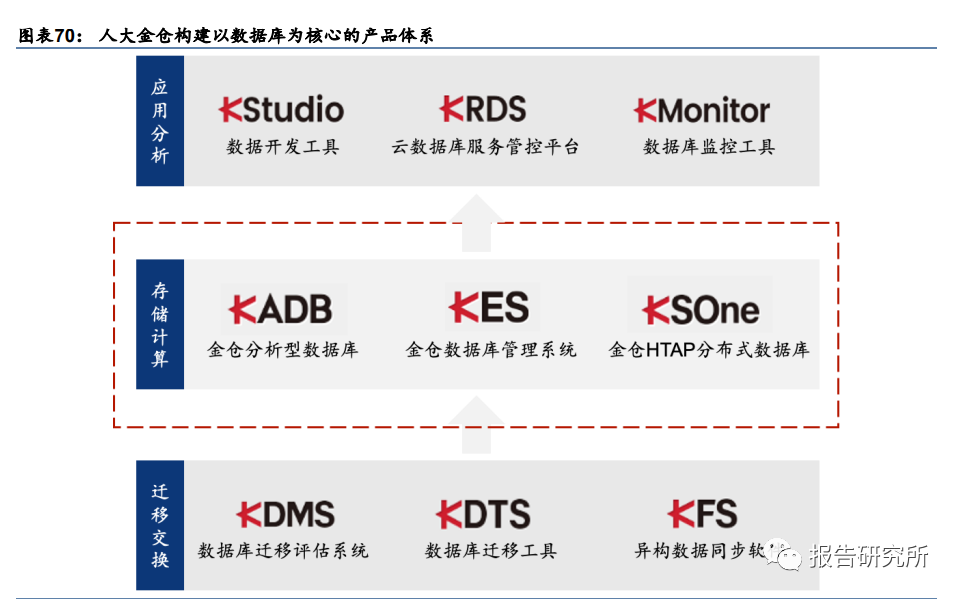 三大数据库产品各具优势,使用多类型应用场景。1)KES:KingbaseES 作为人大金仓的 通用型数据库产品,是一款面向大规模并发交易处理的企业级关系型数据库,严格支持 ACID 特性,具备迁移简单、高度容错、系统自治、兼容性好的突出优势,并提供可覆盖迁 移、开发及运维管理全使用周期的智能便捷工具;2)KADB:KingbaseAnalyticsDB 采用 shared-nothing 分布式架构,是一款具有高性能、高扩展性能力的 MPP 数据库产品,适用 于数据仓库、决策支持、高级分析等分析类应用场景;3)KSOne :是人大金仓自主研发 的 HTAP 分布式数据库,拥有高可靠,高安全,弹性伸缩,高效备份恢复等关键能力,可 以为海量数据、海量并发用户、高负载压力、高连续性要求的业务系统提供强有力支撑。
