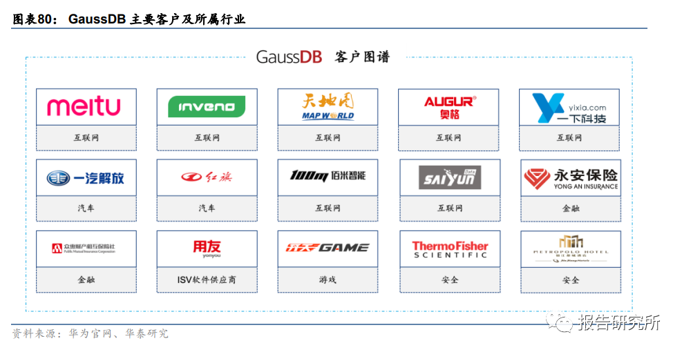 AI 原生&支持异构计算。华为 GaussDB 是一个企业级 AI-Native 分布式数据库,可为超大 规模数据管理提供高性价比的通用计算平台,也用于支撑各类数据仓库系统、BI 系统和决 策支持系统,为上层应用的决策分析提供服务。GaussDB 采用 MPP(Massive Parallel Processing))架构,支持行存储与列存储,提供 PB 级别数据量的处理能力。GaussDB 是 全球首款 AI-Native 数据库,能够同时支持 X86、ARM、GPU、NPU 等异构计算,布局全 球 7 大区域,服务金融、政企、互联网、游戏、汽车等行业标杆客户超 2,500 家。