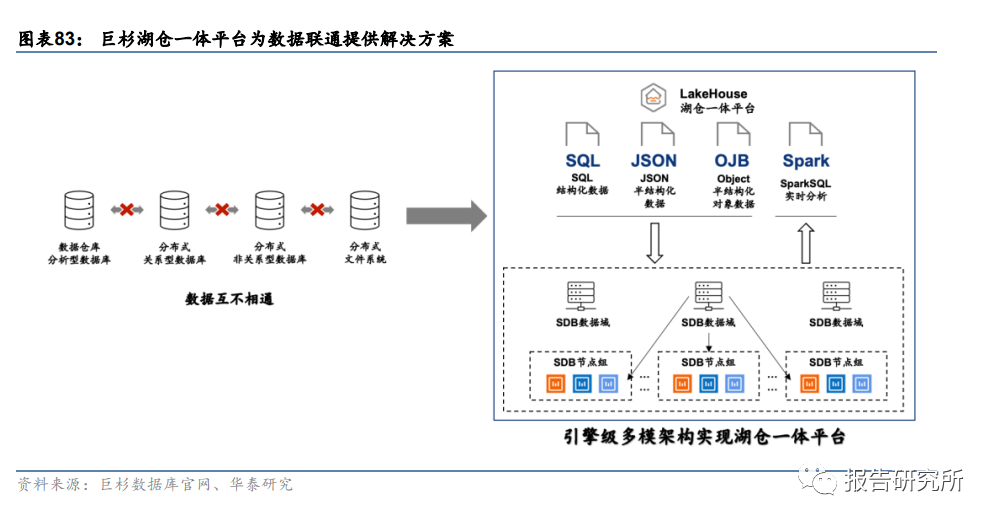 湖仓一体平台为数据联通提供解决方案。巨杉推出的湖仓融合平台 SequoiaDP 以分布式数 据库 SequoiaDB、内容管理平台 SequoiaCM 为基础,打破了数据湖与数据仓库割裂的体 系,可以为上层应用提供“一数一源”的数据基础设施。湖仓一体架构除了具备多模能力, 兼容多种结构化数据、半结构化数据和非结构化对象数据引擎以外,还可以提供包括流式 计算、高性能列存分析引擎、跨引擎数据 ACID 一致性等能力,支持 Tableau、Power BI、 帆软、SmartBI 等国内外分析工具,解决了独立建设、管理的数据库数据互不相通的问题。
