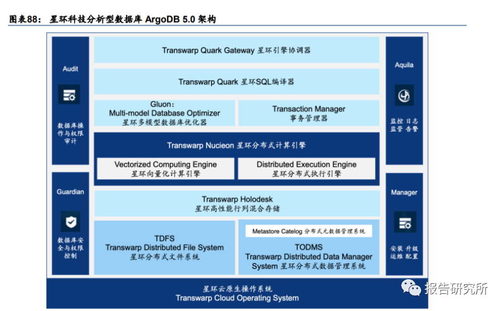 布局分布式数据库,搭建数据服务闭环。星环科技成立于 2013 年,专注于企业级容器云计 算、大数据和人工智能核心平台的研发和服务,目前已形成包括大数据与云基础平台(大 数据基础平台 TDH、数据云平台 TDC)、分布式关系型数据库(ArgoDB、KunDB)、数据 开发与智能分析工具(大数据开发工具 TDS、智能分析工具 Sophon)在内的产品体系。ArgoDB 与 KunDB 分别为分析型、交易型数据库产品:1)ArgoDB:是一款具备多模型、 联邦等特性的高性能分析型分布式数据库,于 2019 年成为全球第四个通过 TPC-DS 基准 测试并经过 TPC 官方审计的数据库产品;2)KunDB:是一款兼容 SQL 标准语言的交易 型分布式数据库,可支持高并发交易场景的核心业务。