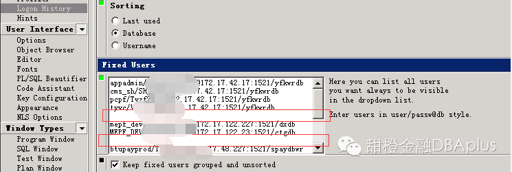 fixed users这里可以换行,已示清晰。plsql实际登陆时会忽略原来的换行的