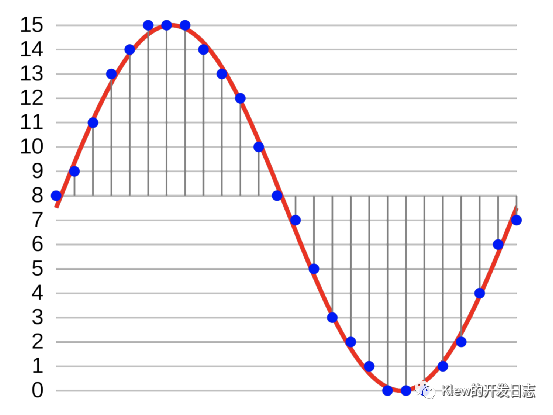 采样位数就是用来表示一个采样点数值的 bit 位数。图中蓝点对应的值得范围是 0~15,因此只要使用 4 位就能满足需求了,因此采样位数就是 4。显然,采样位数越高声音就记录得越精细。