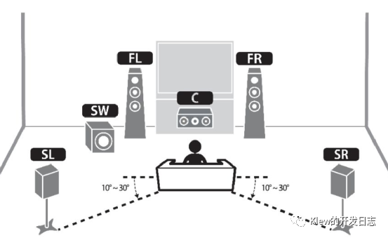 如下是一个 5.1 声道家庭影院示意图,六个扬声器分别是 :