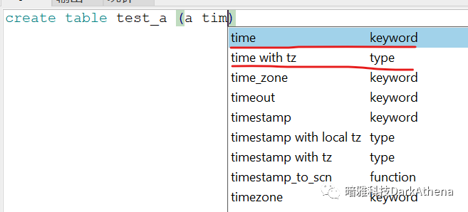 然后再回到type,先按照通常建表的方式,来输入一段sql,会发现工具自动提示了"time"这个关键词和"time with tz"这个type,当然这两种其实都会报错的。