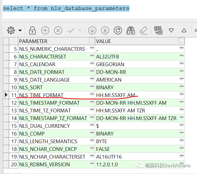 第一个数字的范围为 0-9. 可是,0到9的秒数都是完整的,联想到之前曾见过同事讨论timestamp(6)和timestamp(9),自然就联想到了类似的含义,即这个数字表示秒后小数点多少位,但秒后咋格式化来着我忘了,就查了下nls_database_parameters,这一查,又发现个之前没注意的参数