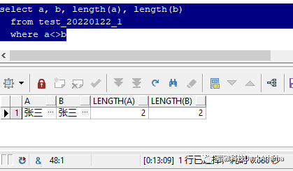 上面这个sql,查询了a和b两个字段,均为"张三"两个汉字,并且使用length函数检查,长度均为2。但是,当你看到下面这几个sql的输出结果时,很有可能第一反应是: