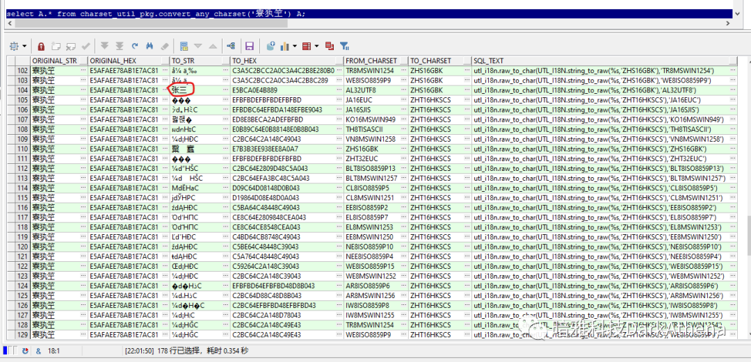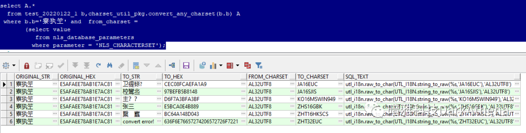 所以我开发了一个plsql包,穷举转换,输出一个表格,用户可肉眼排查乱码是怎么产生的(为减少数据输出条数,仅针对某一方有亚洲语言字符集参与的乱码)